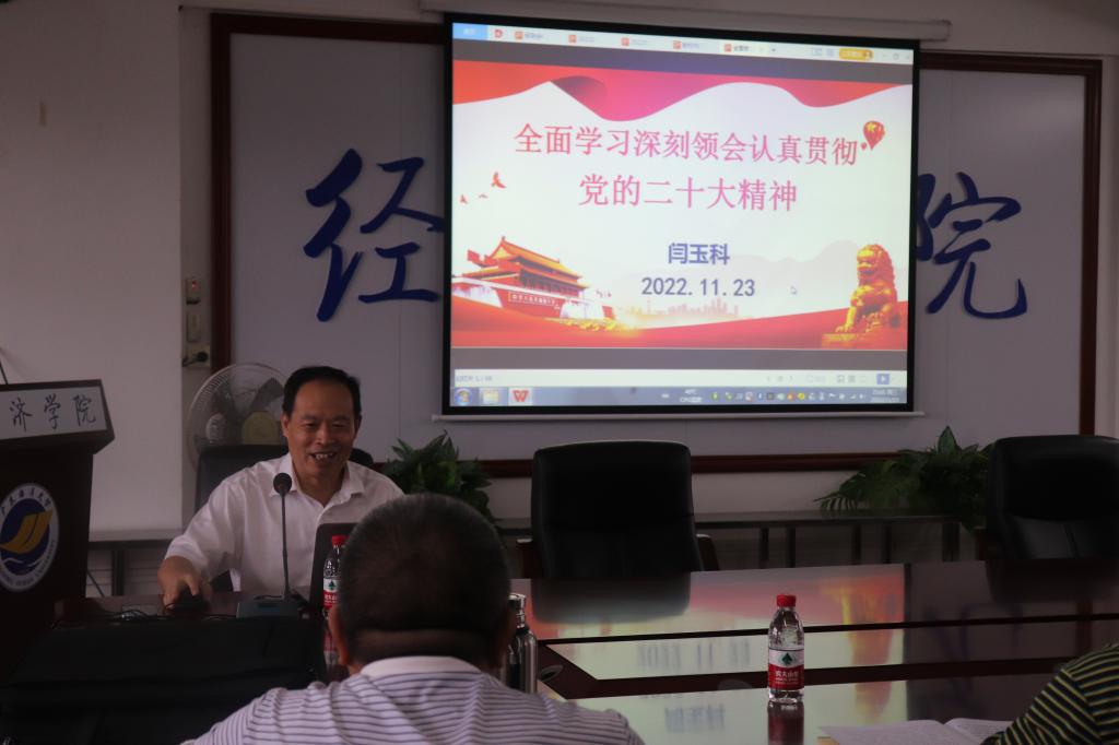 11月23日下午,经济学院在广学楼718召开党的二十大精神宣讲报告会,邀请到学校党委理论宣讲团成员闫玉科教授为大会做报告,经济学院全体教职工及部分学生党员共63人参加会议,会议由学院党委书记陈创主持。
