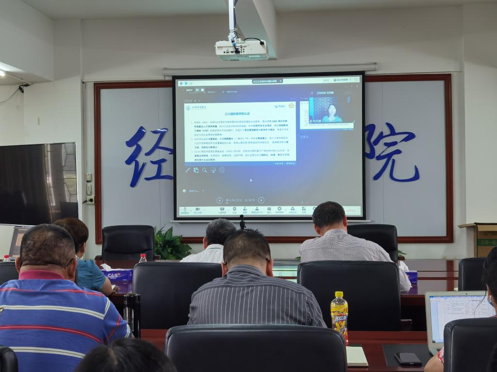 6月8日下午,经济学院在广学楼(主楼)718会议室通过线上线下相结合的方式召开了bga国际认证专家辅导会。学校教育教学质量监控与评估中心主任黄晋等相关职能部门代表、学院全体教职工、管理学院部分领导老师将近100人参加。中南财经政法大学工商管理学院国际认证办公室主任、经济贸易系主任、国际贸易硕士导师组组长、中国(湖北)自贸实验区研究院常务副院长吴英娜教授受邀以线上形式做bga国际认证辅导报告。学院副院长杨新华教授主持会议。