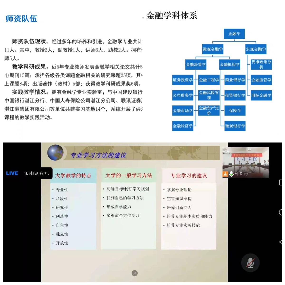 一直以来,学院都非常重视新生的专业教育,所开展的专业教育是以学生成长成才为导向,旨在帮助新生提前了解学科专业概况、做好大学四年的学业规划、树立人生奋斗目标。本次三个教学系面向2021级新生,主要从专业发展现状及未来发展愿景、人才培养方案及课程体系构成、实习实践要求、就业趋向等方面介绍本专业的情况。国贸系陈文汉主任重点讲述了国际经济与贸易行业现状、学科情况、专业学习方法;经济系蒋重秀主任从“什么是经济学”、“如何学习经济学”、本专业概况三方面进行了讲解;金融系罗帅副主任向同学们介绍了金融行业现状、金融学科情况、专业未来前景。通过专业学习和教育,2021级新生对自己的专业有了初步的认识和了解,已基本掌握本专业学习的要求,坚定了学好专业的信心。