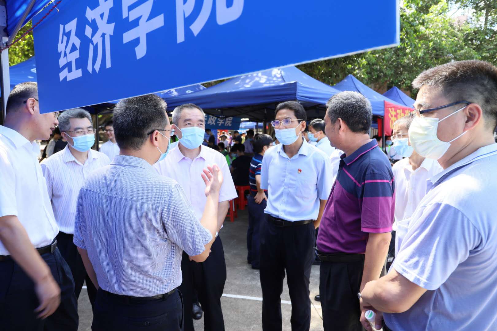 12日,新生报到高峰期,学校党委书记曹俊明、校长潘新祥、党委副书记林晓敏、副校长刘东超等学校领导莅临我院新生接待点,亲切慰问并指导接待工作,与工作人员合影留念。