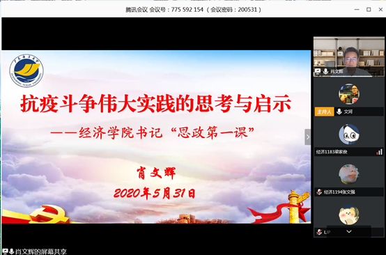 5月31日、6月18日,经济学院党委书记肖文辉及代理院长居占杰利用“腾讯视频会议”平台,分别以《抗疫斗争伟大实践的思考与启示》与《做新时代的奋斗者》为题讲授2019-2020学年第二学期“思政第一课”。全体学生党员、学院团委、学生会干部、“青马学员”、研究生和入党积极分子约600人次齐聚“云端”听课。