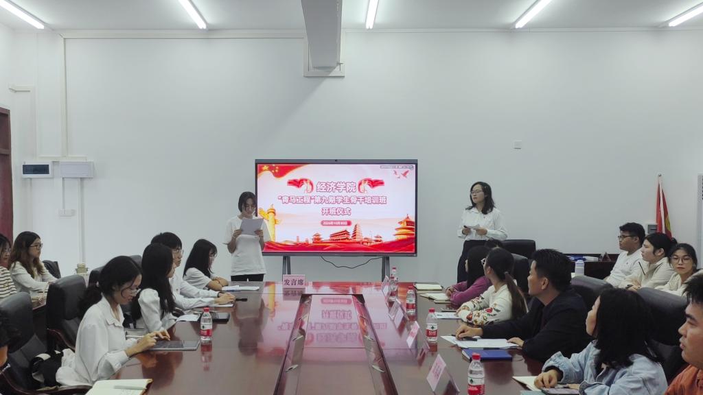 10月30日下午,经济学院在文科楼3号楼715会议室举行了第九期“青马工程”学生骨干培训班开班,学院正处级辅导员、党委副书记钟桂安,团委书记兼青马班班主任叶梦怡、辅导员温莉莉、陈家敏、李斯雯、肖启映及青马班组委会成员、全体学员参加了仪式。