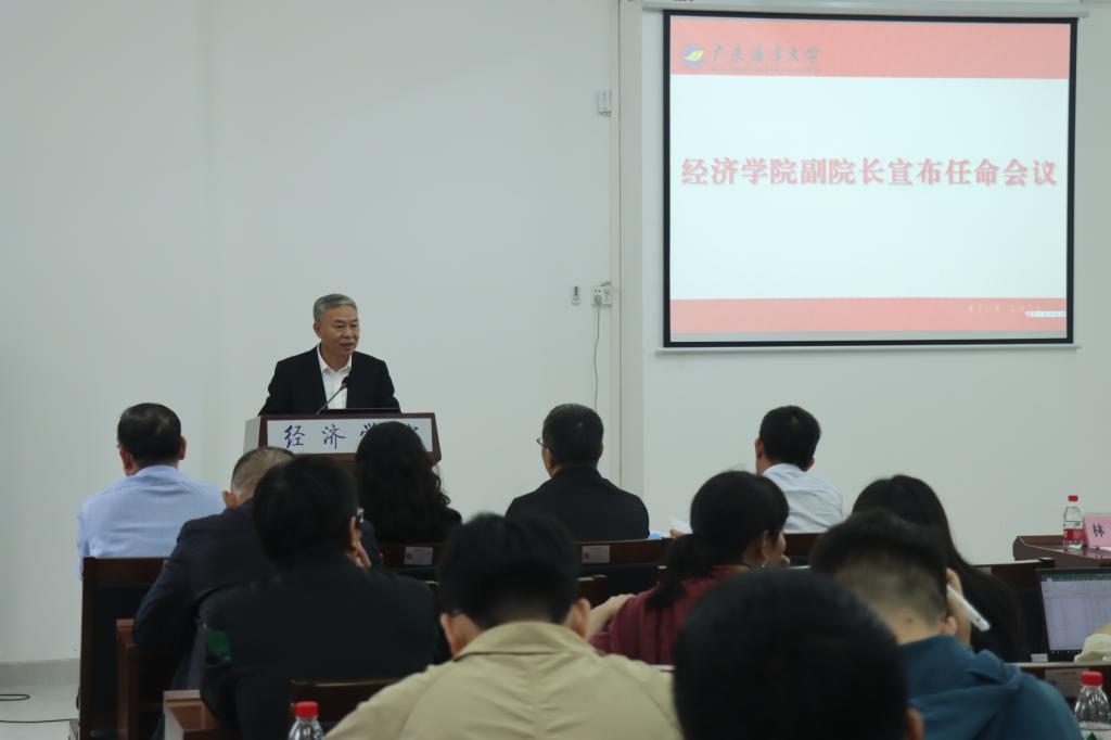 学校党委常委、宣传统战部部长林宇出席会议并讲话。党委组织部部长曾庆新宣布任命罗帅同志为经济学院副院长决定。学院党委书记陈创、院长陈伟代表班子作了表态发言,罗帅同志作了任职发言。