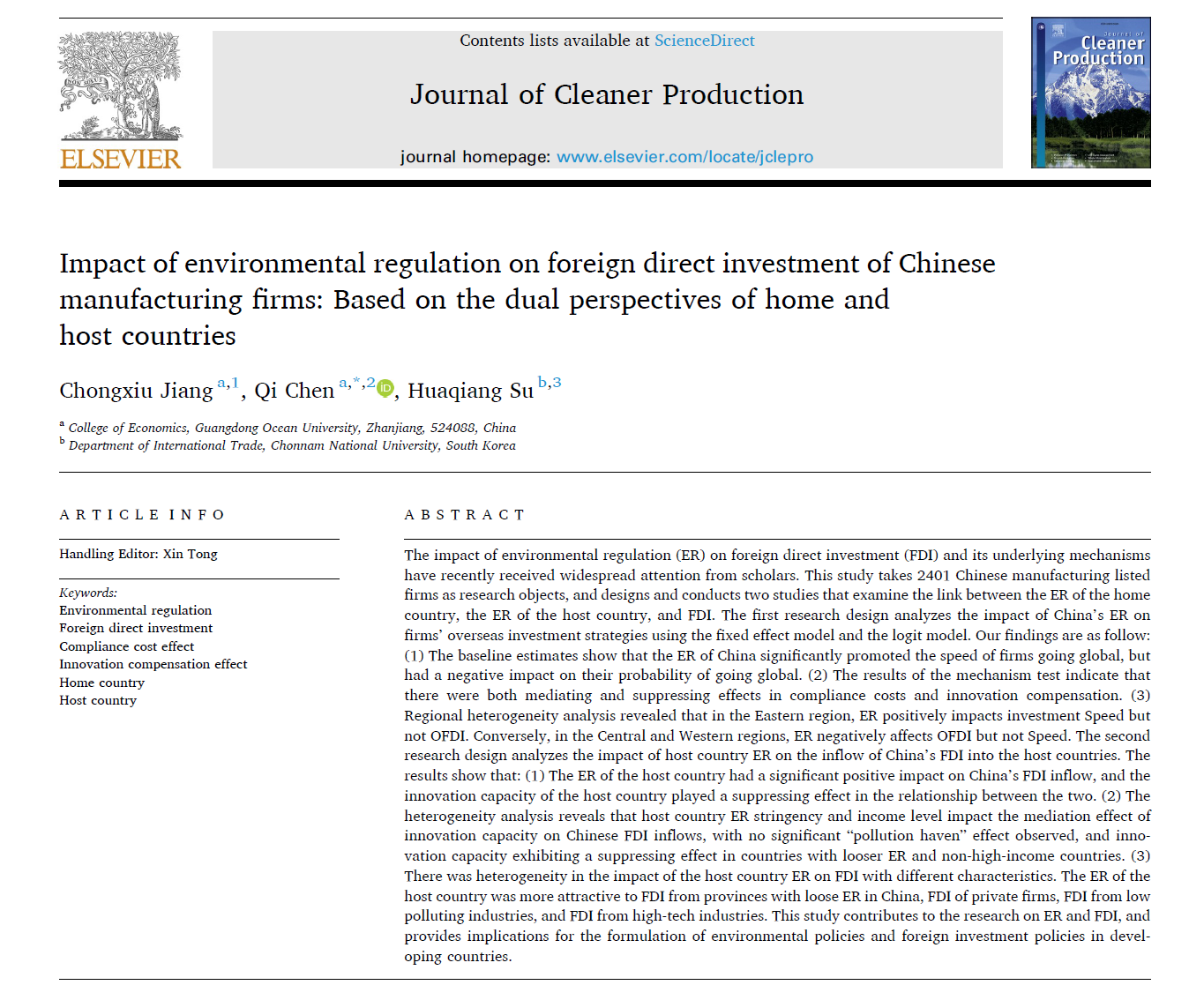 广东海洋大学经济学院蒋重秀副教授作为第一作者,陈琦老师担任通讯作者,在国际环境科学与生态学领域顶级期刊《journal of cleaner production》(简称jcp)发表题为《impact of environmental regulation on foreign direct investment of chinese manufacturing firms: based on the dual perspectives of home and host countries》的重要研究成果。该期刊2023-2024年最新影响因子为9.8,五年影响因子10.2,位列jcr环境科学与生态学q1区,同时入选中国科学院分区(2023升级版)一区top期刊。这是我院在环境经济与跨国投资交叉研究领域的重要突破。
