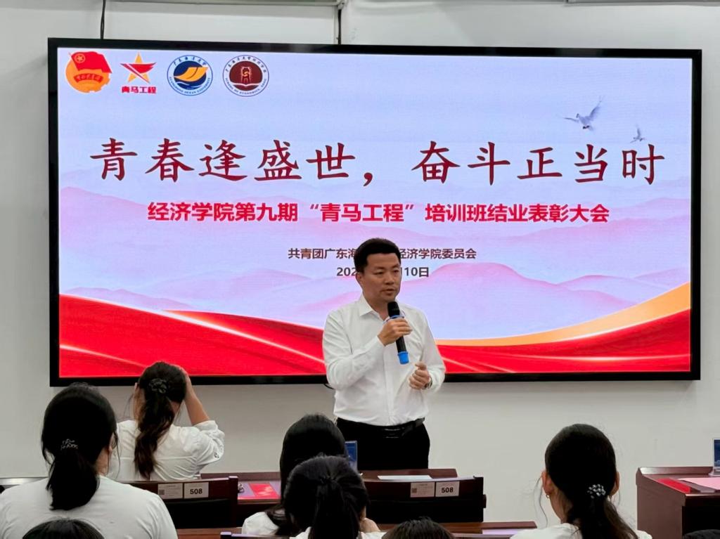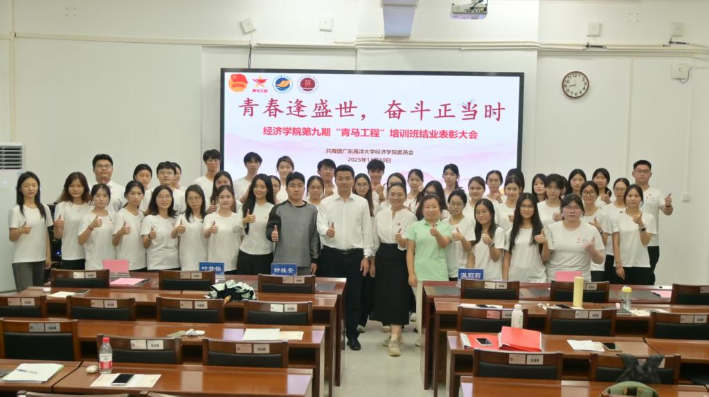 11月10日晚,经济学院第九期“青年马克思主义者培养工程”(以下简称“青马工程”)培训班结业表彰大会在博文楼c栋508报告厅圆满举行。学院正处级辅导员、党委副书记钟桂安,学院团委书记、第九期青马班班主任叶梦怡,辅导员温莉莉、肖启映、郑树杰,各兄弟学院青马班学员代表及本期51名全体学员齐聚一堂,共同见证青春信仰绽放的璀璨时刻。