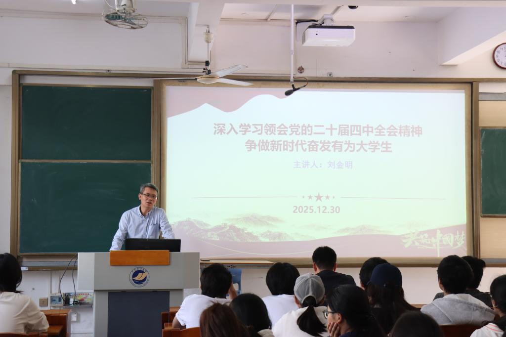 刘金明简要阐述了“十四五”时期我国发展取得的重大成就,以及党的二十届四中全会在基本实现社会主义现代化关键阶段的重要意义,解读了“十五五”时期经济社会发展的指导方针、主要目标和必须遵循的原则,解析了“十五五”期间经济社会发展的重点战略任务与重大举措,结合阐释习近平总书记对广大青年的殷切期望与寄语要求,引导青年学生以争做新时代奋发有为大学生为着力点,积极学习和贯彻党的二十届四中全会精神。他勉励同学们要以习近平新时代中国特色社会主义思想凝心铸魂,着力向上向善,坚定理想信念,练就过硬本领,锤炼品德修为,担当时代责任。