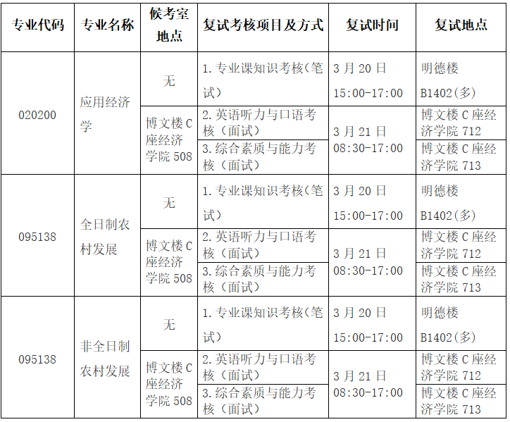 专业课笔试、同等学力加试开考15分钟后,迟到考生不准进入考场参加当科考试,交卷出场时间不得早于当科考试结束前30分钟。农村发展专业一志愿考生同等学历加试笔试时间:3月20日8:00-12:00,考试地点博文楼c座经济学院712。