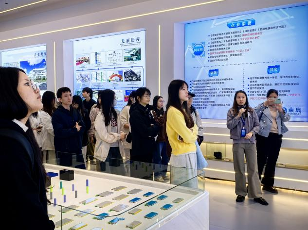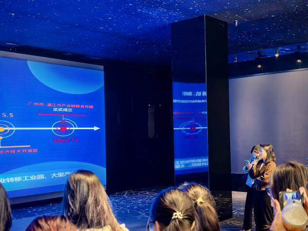 在广州—湛江市产业转移合作园,讲解员向师生们介绍了产业园的发展史以及园区结构和未来发展计划。园区融合六大功能园区,重点发展新能源与储能、新材料、电子信息三大主导产业,同时培育装备及零部件制造、海洋生物医药、食品产品加工三大特色产业,具备发展先进制造业的显著优势。