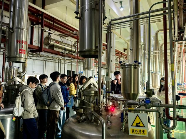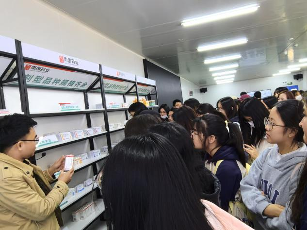 在广东南国药业有限公司,同学们先在药品展示室了解了该企业生产的药品和功能,后四个班共分为四组到生产车间了解药品生产过程。车间有严格的程序,在药品售卖前需要经过投料→水提取→储罐储藏→浓缩→制成打包前处理→剪切室→存放药材的步骤,才能最后上市。讲解员向学生们详细介绍了各个步骤的操作,同学们都受益匪浅。