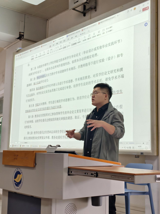会议第三项议程由刘宏楠老师就学术诚实问题进行深入解读。刘老师结合《广东海洋大学本科生学位论文作假行为处理办法》,系统阐述了学术不端行为的表现形式与严重后果。他通过典型案例分析,警示全体学生务必恪守学术道德,坚守诚信底线,独立完成毕业论文,杜绝任何形式的抄袭、剽窃、代写等行为,并要求指导教师切实履行审查与教育责任,共同维护经济学院学术尊严。