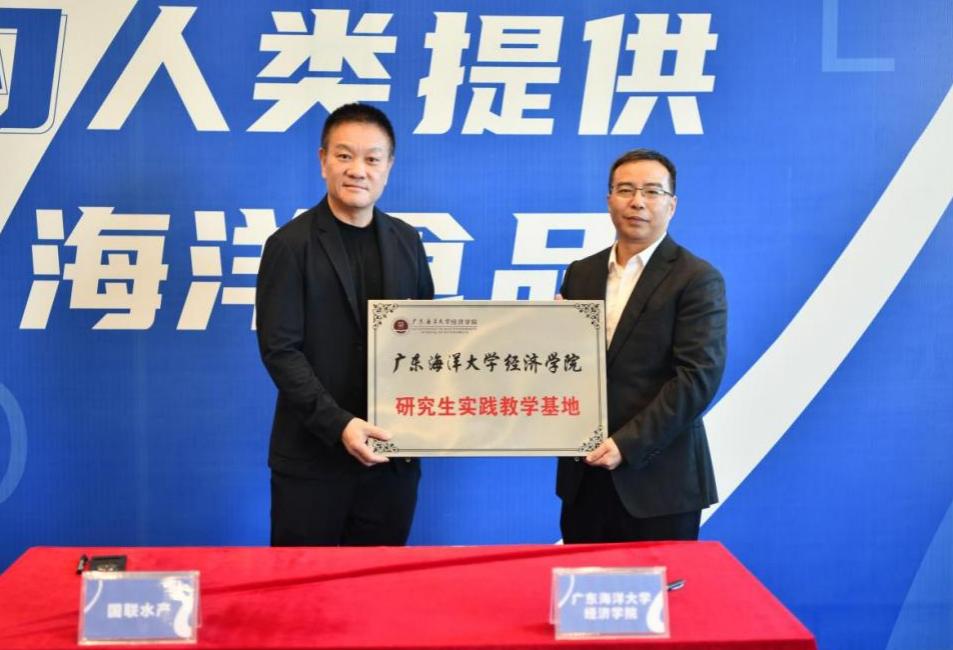 签约仪式上,陈伟与公司董事长李忠代表双方正式签署《实践教学基地共建协议书》《产学研合作协议书》,同时,陈伟向国联水产授予“广东海洋大学经济学院研究生实践教学基地”牌匾,这一举措标志着双方合作进入实质性落地阶段。学院将依托经贸领域内的学术科研优势,为企业农海产品对外贸易提供智力支持和定制化人才培养等服务。