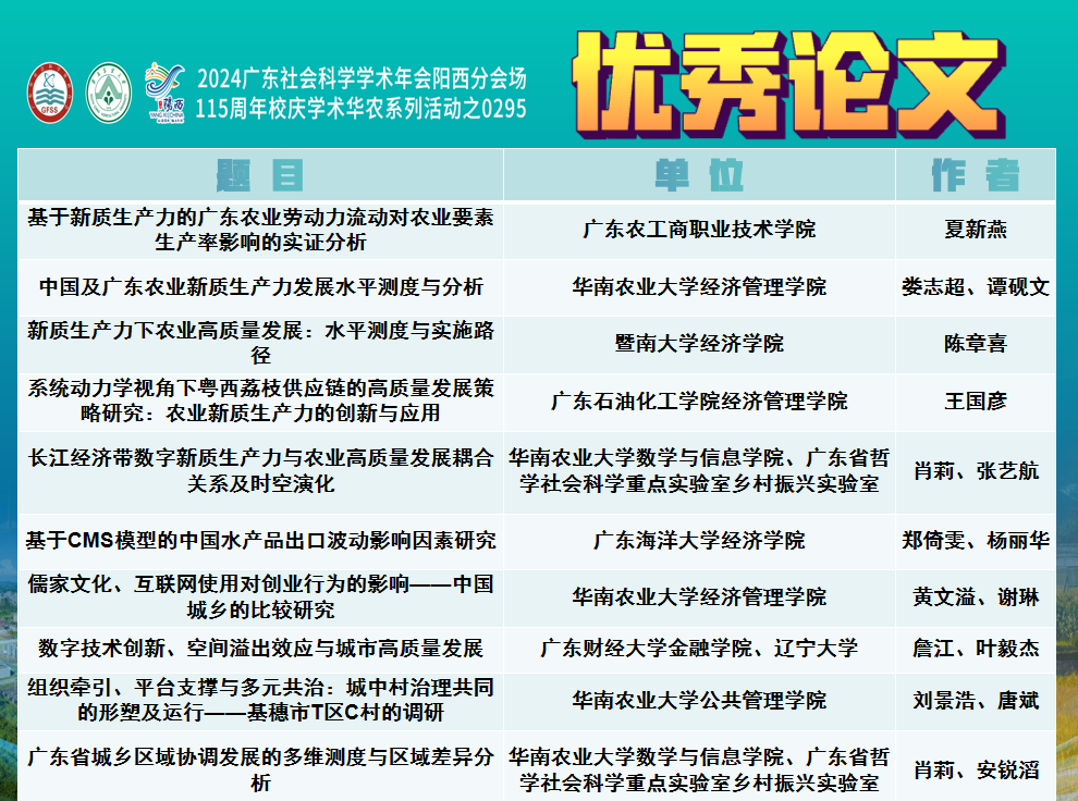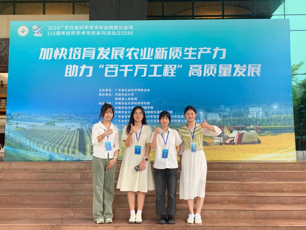 2024年9月20日至21日,2024广东社会科学学术年会阳西分会场在阳西县举行。研讨会由广东省社会科学界联合会主办,华南农业大学和阳西县人民政府协办。我院杨丽华教授指导的研究生郑倚雯、纪晓珂、胡佳和朱楚君受邀参会,其中农村发展专业郑倚雯同学在“专题三:新质生产力与农业高质量发展分会场论坛”作学术报告。