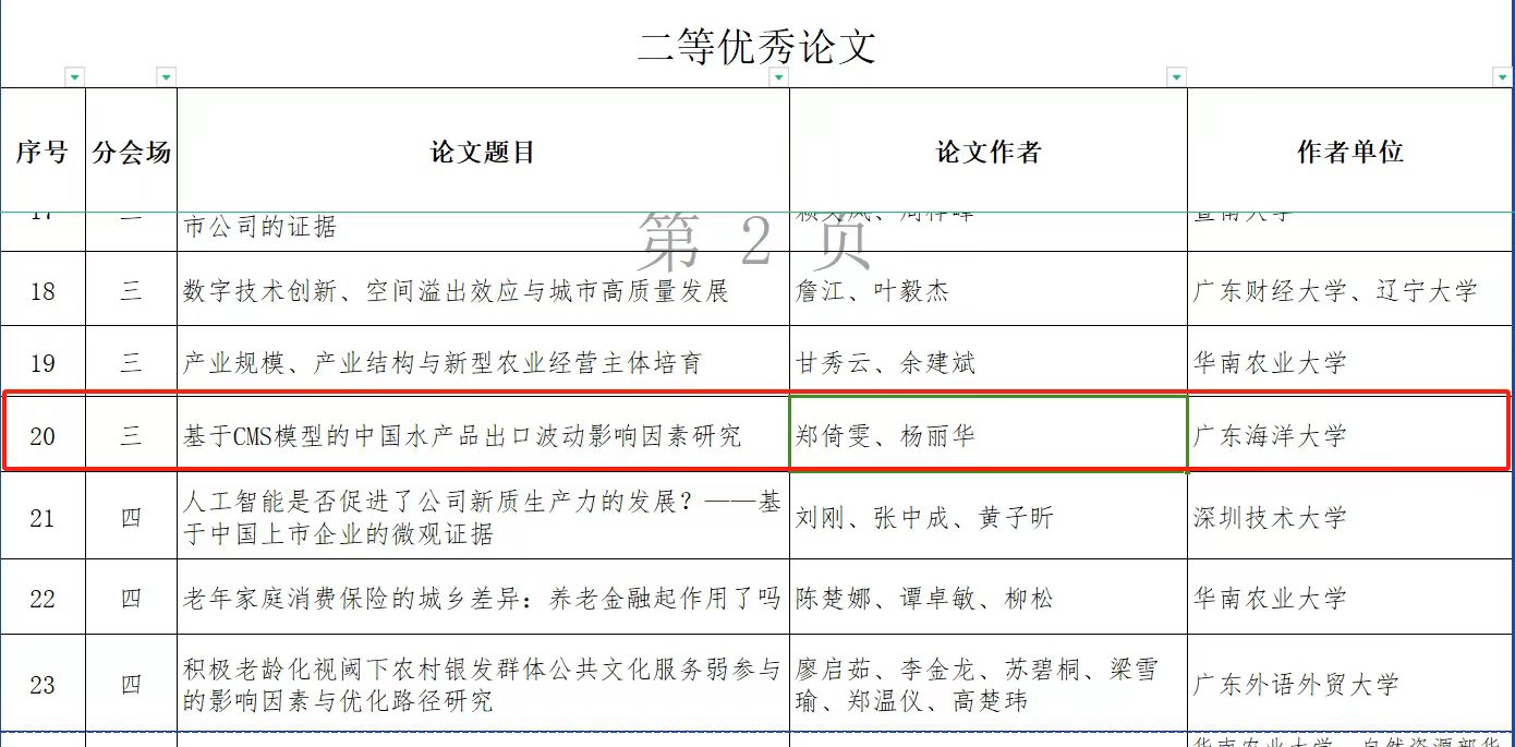 2024 年11月29日,广东省社会科学界联合会于广东人文社科网正式公布2024年广东社会科学学术年会优秀论文名单。其中,经济学院研究生郑倚雯与导师杨丽华教授合作完成的学术论文《基于 cms 模型的中国水产品出口波动影响因素研究》荣获优秀论文二等奖。该论文以大食物观视角切入,针对中国水产品出口波动的影响因素展开深入的实证分析。研究成果表明,出口竞争力效应是造成中国水产品出口波动的关键因素,基于此研究结论,论文提出了具有针对性的对策建议。
