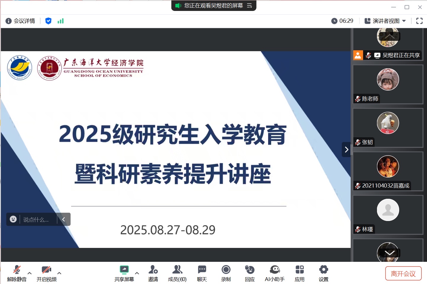 为助力2025级研究生新生提前适应科研环境、夯实学术根基,经济学院围绕“入学教育前置化、素养提升精准化”目标,依托中国学位与研究生教育学会主办的“研究生科研素养提升系列公益讲座”平台,于8月27日至29日组织开展为期三天的入学教育暨科研素养提升活动,覆盖全体57名新生,旨在实现科研启蒙“早起步、开好头”的培养目标。活动由学院辅导员陈家敏全程主持,通过每日明确学习模块与进度安排、实时通过新生群答疑解惑、及时协调解决学习过程中的各类难题,确保培养实效。