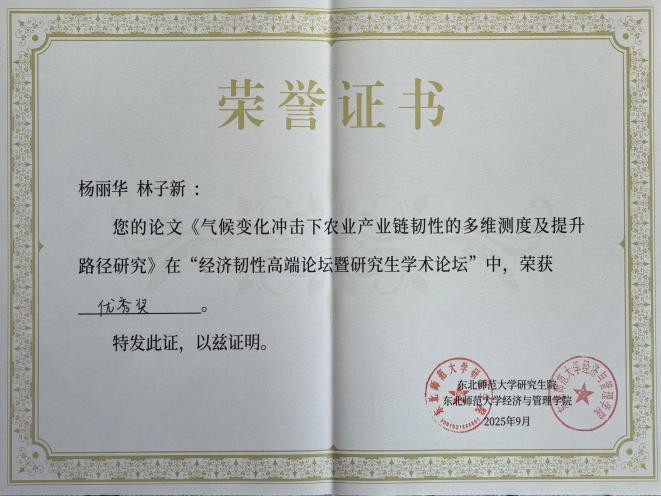 我院杨丽华教授与研究生林子新合作完成的论文《气候变化冲击下农业产业链韧性与多维度测度及路径研究》经大会评审并成功入选。研究生胡佳代表团队进行论文汇报,该论文荣获“经济韧性高端论坛暨研究生学术论坛”优秀论文奖。