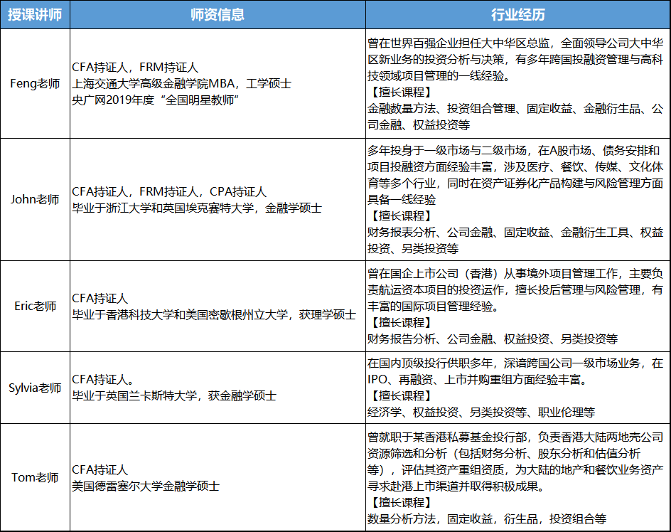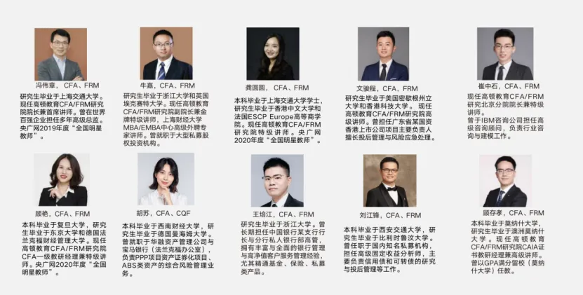 cfa菁英班师资团队全部由行业顶尖人才和中外名校毕业生组成,从事cfa教学研工作长达多年,对于教学工作具有丰厚经验。cfa菁英班全体师资均合作知名企业高顿教育集团,其为我院开展培优计划cfa菁英班的唯一尊龙ag旗舰厅官网的合作伙伴。