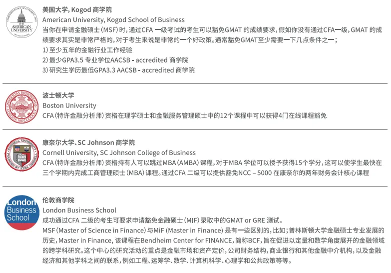 国外商科名校(例如波士顿大学,康奈尔大学,伦敦商学院,多伦多大学等)的商学院在申请留学生时,阶段性通过cfa考试可豁免gmat的成绩要求,部分学校可获得课程豁免。全球更多cfa合作名校及课程,可查阅cfa协会z6尊龙凯时集团官网。
