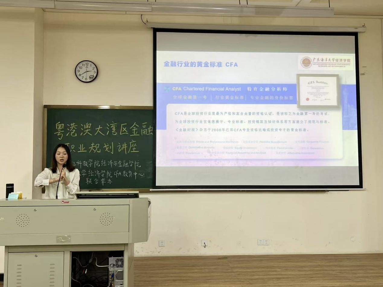 为加强粤西高校合作交流、助力学生科学规划职业生涯,4月15日下午,经济学院cfa教育中心在湛江科技学院知行楼151课室举办“粤港澳大湾区金融职业规划"专题讲座。活动由经济学院cfa教育中心与湛江科技学院经济与金融学院联合主办,邀请经济学院cfa教育中心高级讲师刘臻主讲,湛江科技学院130余名大一本科生参加讲座。